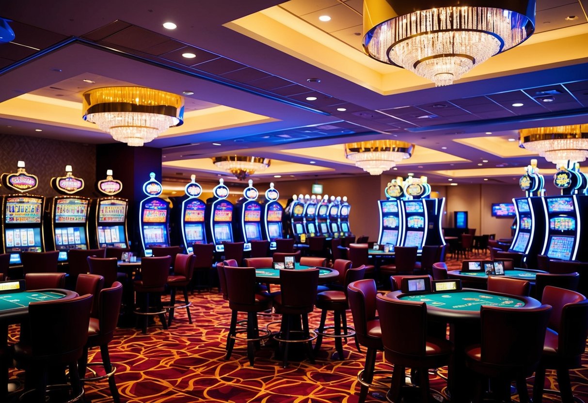 A colorful casino floor with slot machines, card tables, and flashing lights. Customers are enjoying games and drinks