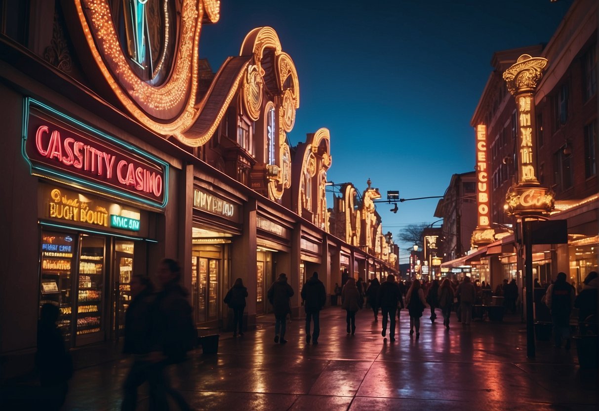 A neon-lit casino sign shines above a bustling street, with people entering and exiting the doors. The words "JeetCity Casino No Deposit Bonus" stand out in bright, bold letters, drawing in passersby